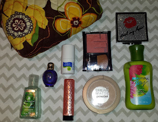 In honor of school starting today I thought I would show you what I have in my makeup bag that I keep in my backpack, or purse if I'm using a larger one. I use a Vera Bradley cosmetic bag. I like it because it has plastic lining on the inside so its easy to clean if something leaks.